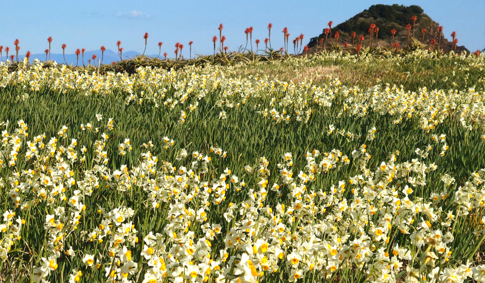 2月に入ったばかりですが、弊社の拠点がある伊豆半島では、河津桜が木によってはすでに満開を迎えています。梅も咲き始め、先日取引先の方と通った下田の爪木崎では水仙がまもなく見頃を迎えそうで(背景写真)、2月に入った今、私だけかもしれませんが、風がなければ、仕事中に寒さを意識する場面は多くありません。
