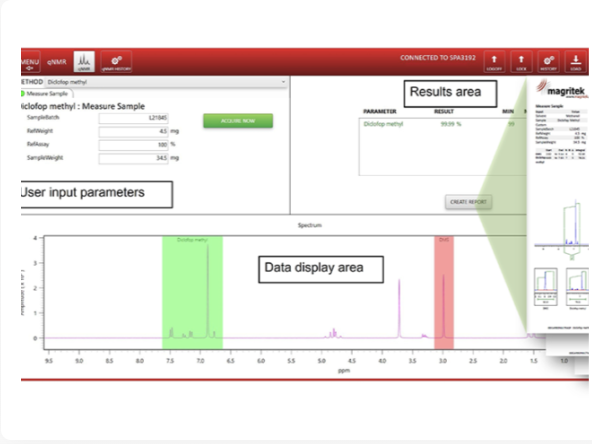 SpinsolveのqNMRモジュールは、製薬や食品などの厳格な基準がある分野で、完全自動で物質の定量分析ができるソフトウェアです。